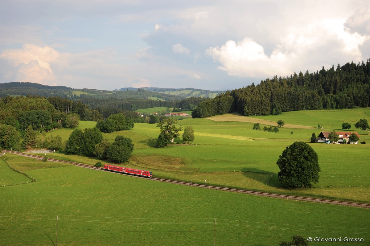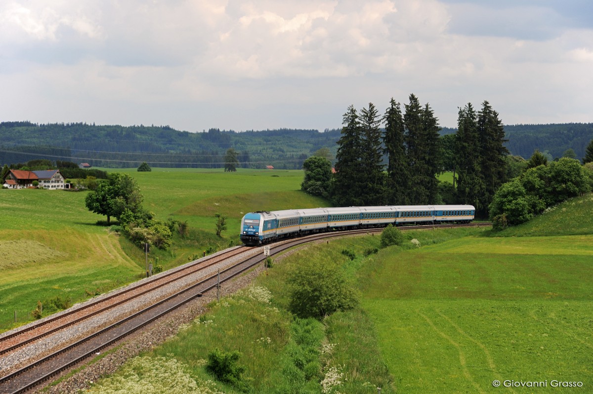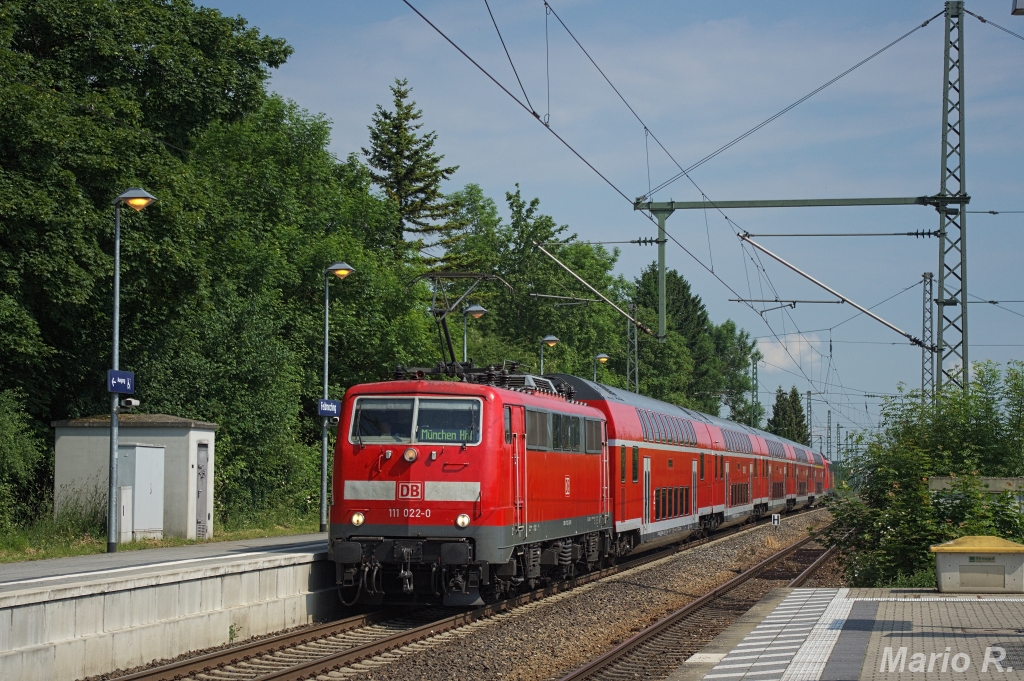 111 022 mit einem der lokbespannten RE-Sandwich aus Passau nach München Hbf. Aufgenommen am 2.6.2014 in Feldmoching