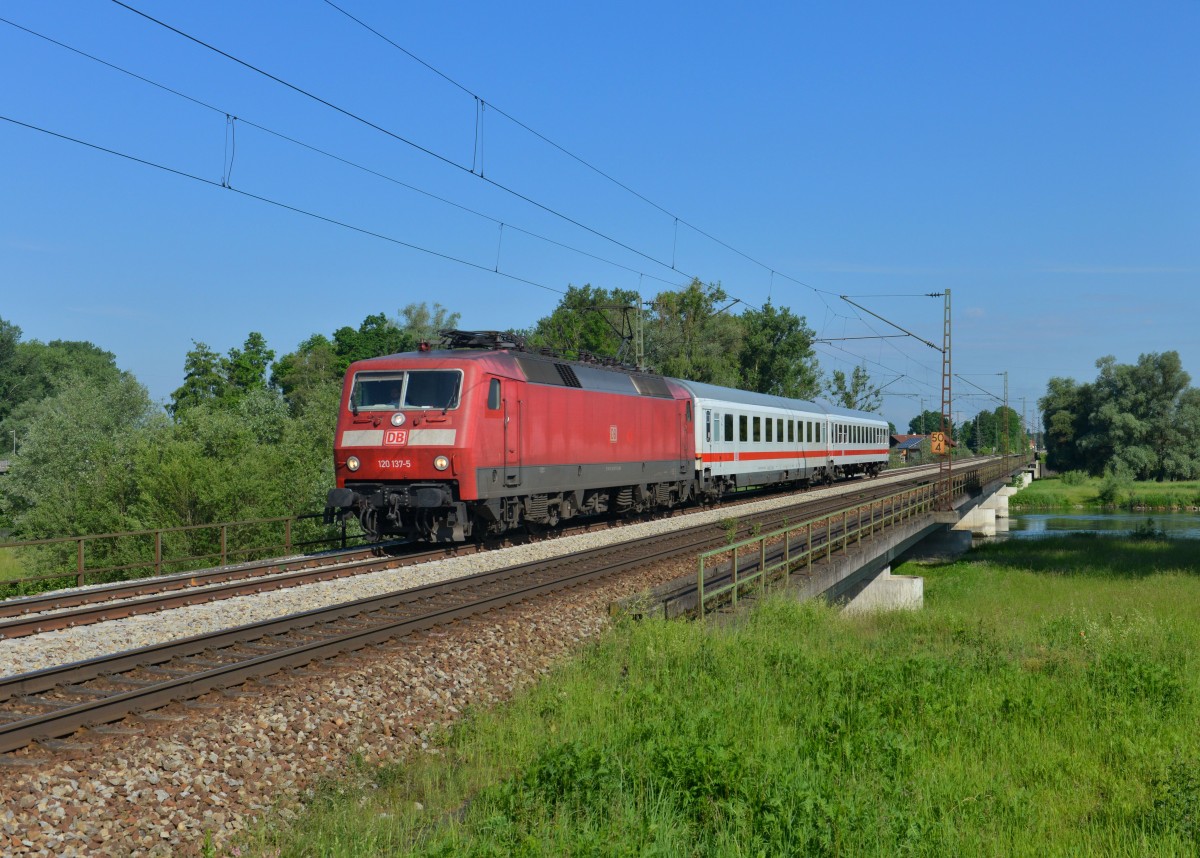120 137 mit zwei IC-Wagen für den IC Rottalerland am 31.05.2014 auf der Isarbrücke bei Plattling.