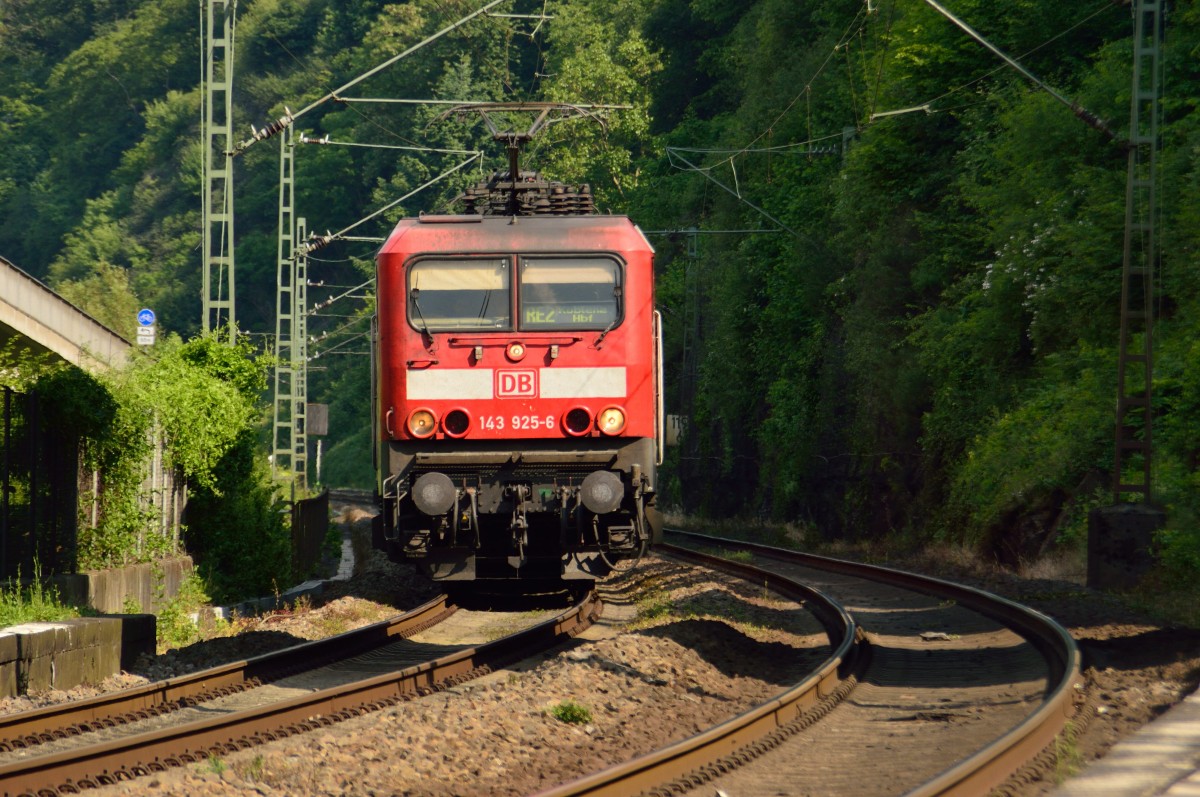 143 925-6 kommt bei Hirzenach mit einem RE2 Sandwich aus Frankfurt nach Koblenz herangefahren.1.6.2014