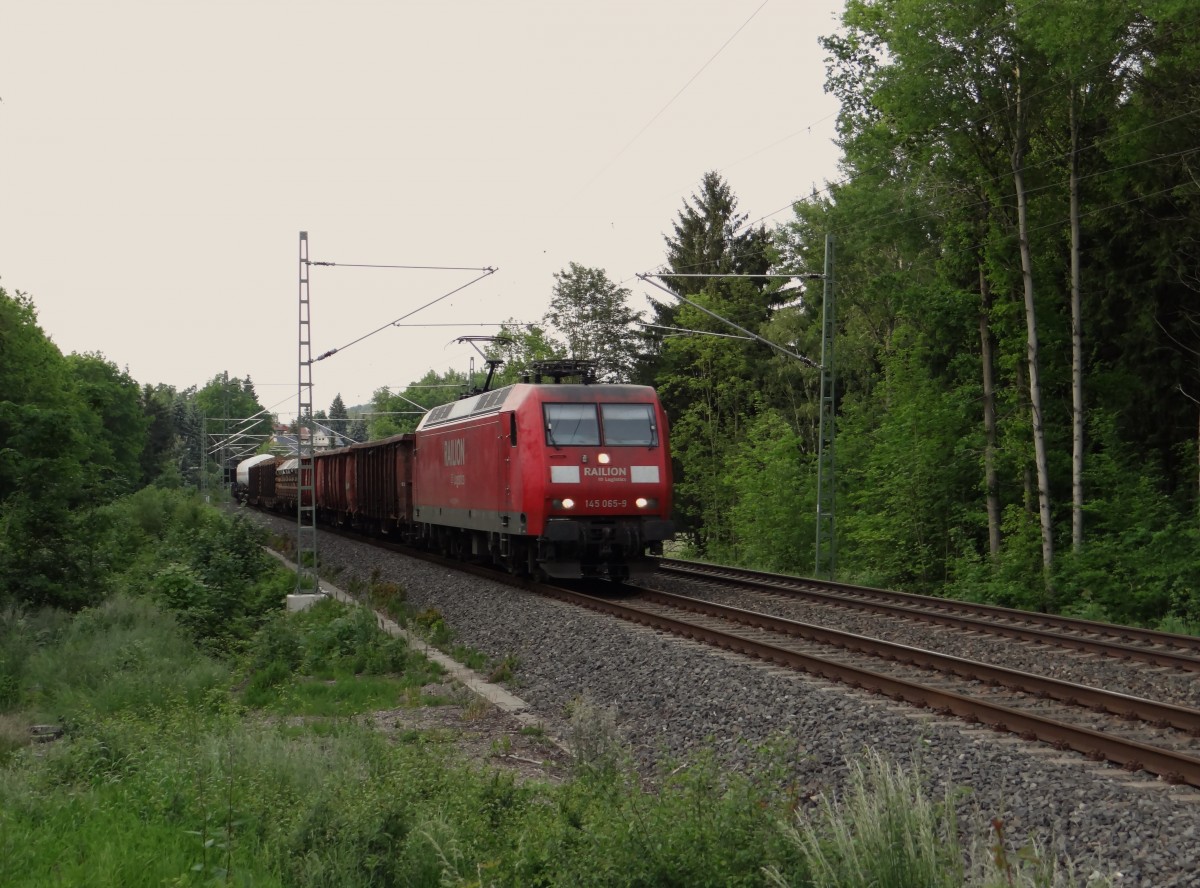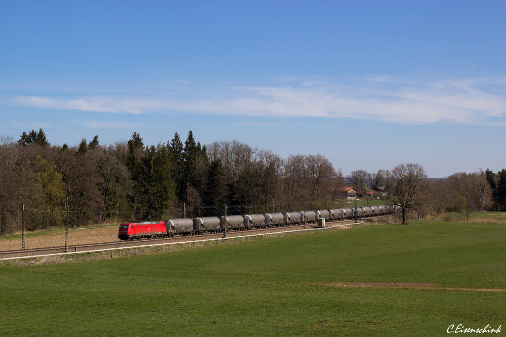 DB 185 217 bespannte am 30.03.14 einen umgeleiteten Silowagen Ganzzug von Salzburg in Richtung München. Gerade hat der Zug Übersee passiert und wird in wenigen Minuten Bernau erreichen.