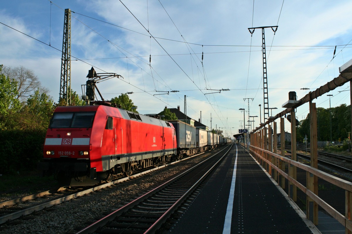 152 059-2 mit einem KLV-Zug aus Basel am Abend des 17.04.14 auf dem Weg in Richtung Norden, fotografiert im Bahnhof Müllheim (Baden).