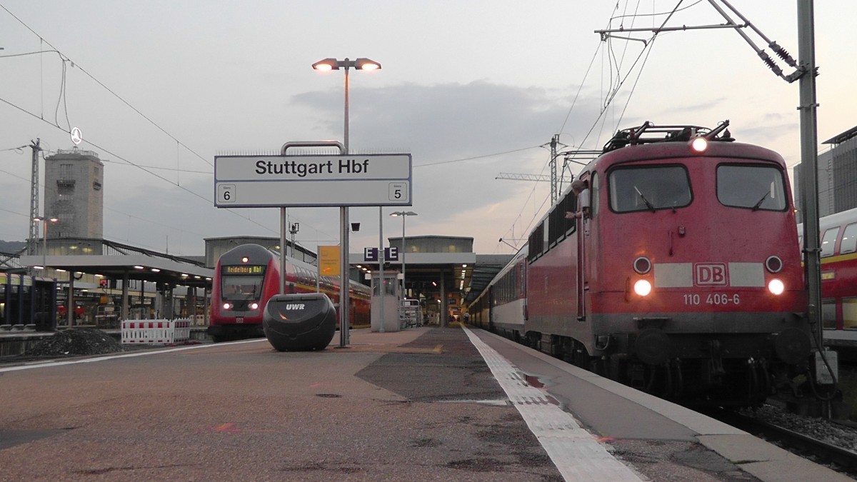Der dunkle Himmel lässt es wie ein Gegenlicht aussehen, obwohl die Sonne eigentlich im Rücken wäre. 120 134-2 schiebt ihren IC richtung Tunnel der Neubaustrecke. Zuffenhausen, Mai 2014.