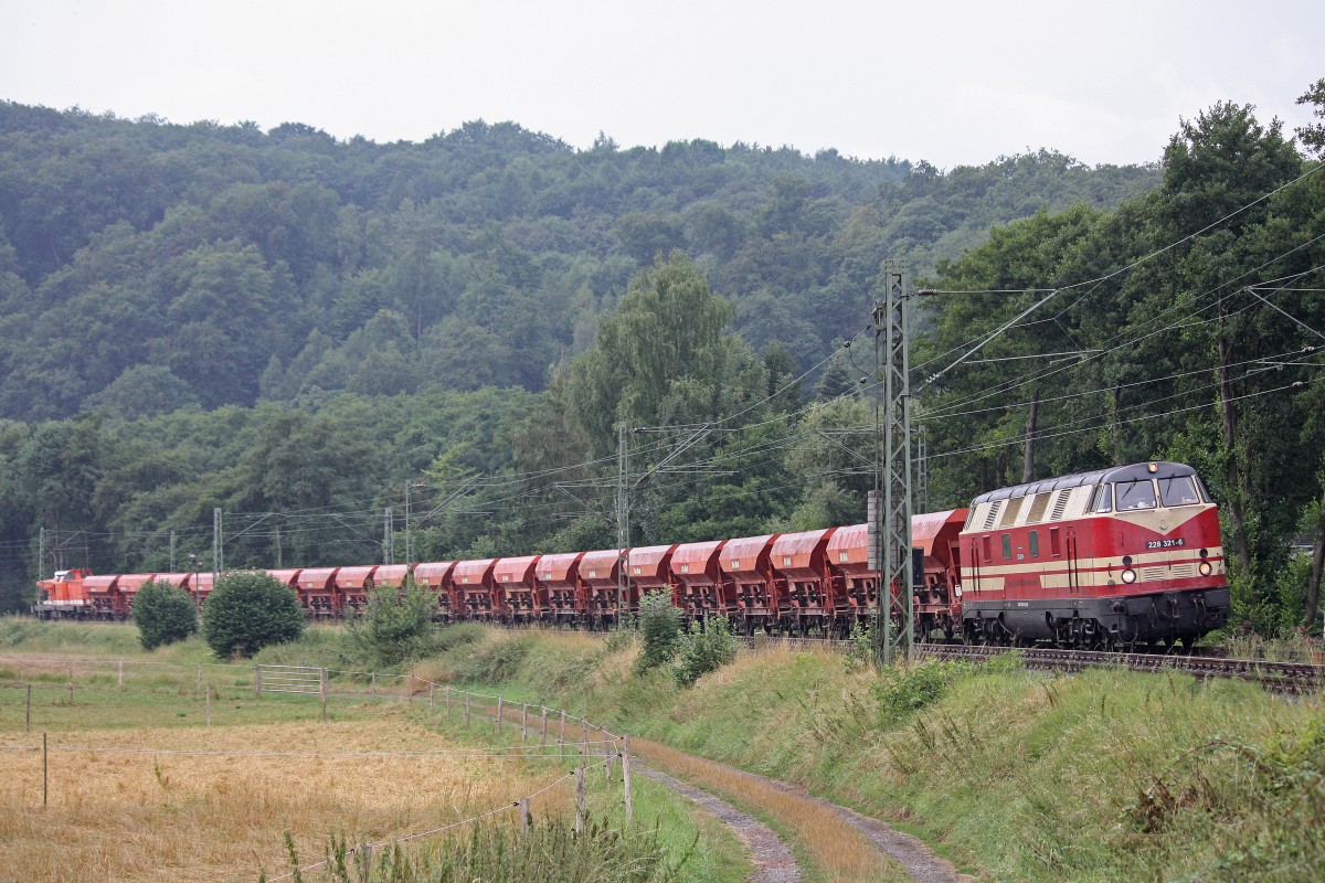 CRS 228 321 am 14.8.13 mit einem Schotterzug und Locon 212 am Schluss in Essen-Kettwig auf dem Weg zur Baustelle in Essen-Werden.