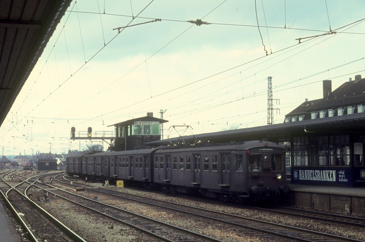 DSB S-Bahn Kopenhagen am 4. März 1973: Eine Garnitur der Linie F verlässt den S-Bf Hellerup und fährt weiter nach Klampenborg.