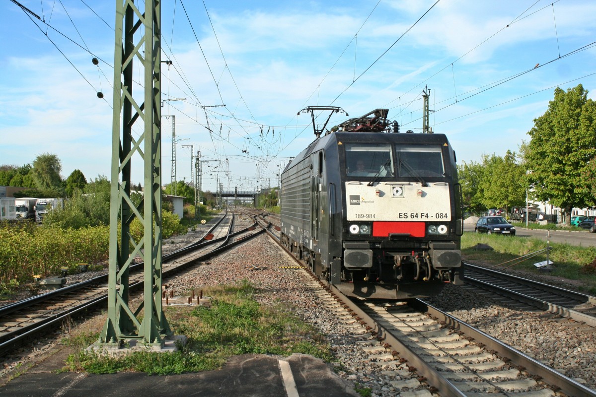 Ganz alleine tuckerte ES 64 F4-084 am Abend des 17.04.14 über die Rheintalbahn gen Basel. Hier konnte ich die Lz-fahrende Lok im Bahnhof Müllheim (Baden) aufnehmen.