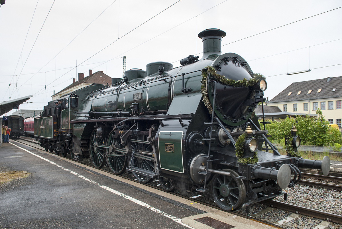 Im Bf Nördlingen setzt S3/6 3673 zurück an den Museumszug des Bayerischen Eisenbahnmuseums, den sie ins Bw zu ziehen wird. Am 29.05.2014 sollte eigentlich 3673 ihre Abschiedsfahrt mit diesem Zug vor ihrer Abstellung wegen Fristenablaufs bestreiten. Doch wegen eines Radsatzschadens war sie leider nicht streckentauglich. Zuglok war an diesem Tag 41 1150-6.