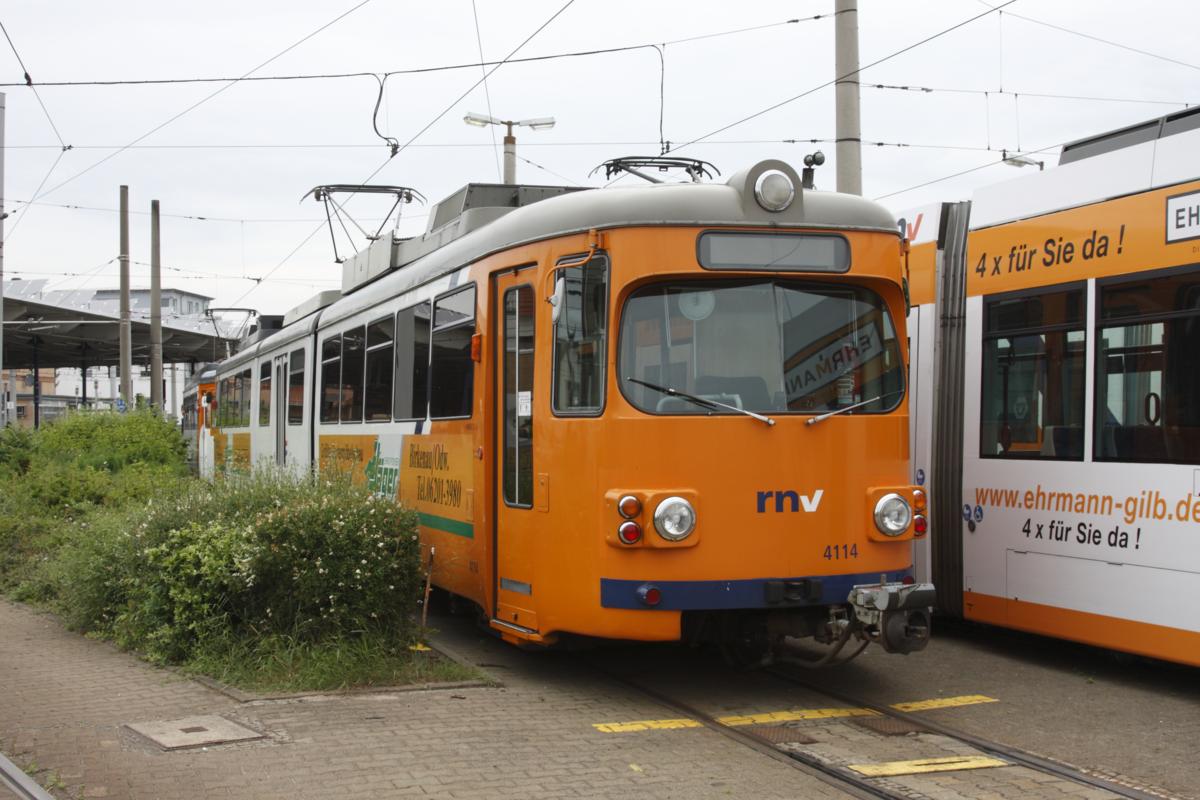 Im Depot in Mannheim - Käfertal stand am 29.5.2014 der schon etwas ältere Triebwagen 4114 des RNV.