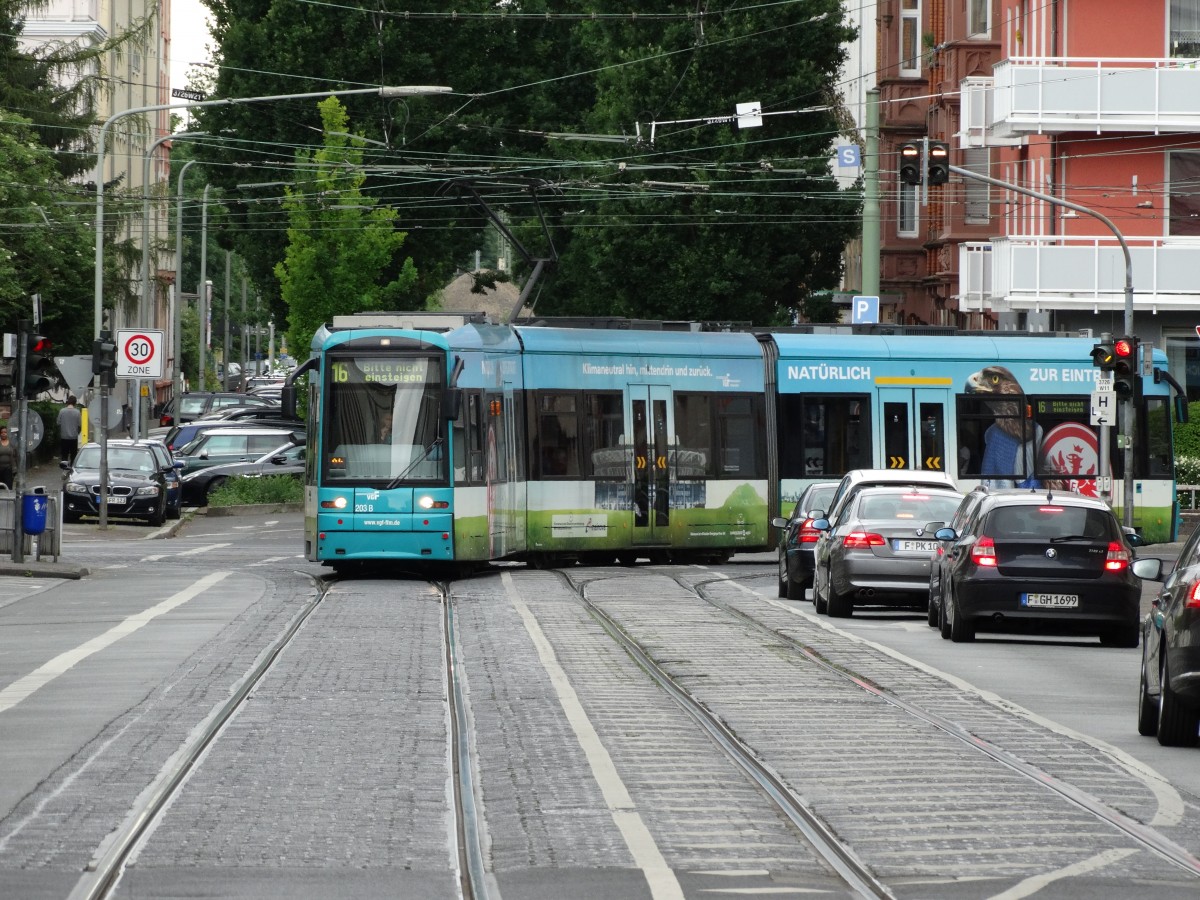 VGF S-Wagen 203 am 24.05.14 in Frankfurt am Main kurz vor dem Fahrtende Südbahnhof. An diesem Tag sind die Wagen nur bis Süd Bhf auf der 16 gefahren, da am Lokalbahnhof neue Gleise verlegt wurden. Es wurde ein SEV (Schienenersatzverkehr) mit Bussen in Richtung Offenbach Stadtgrenze eingerichtet.