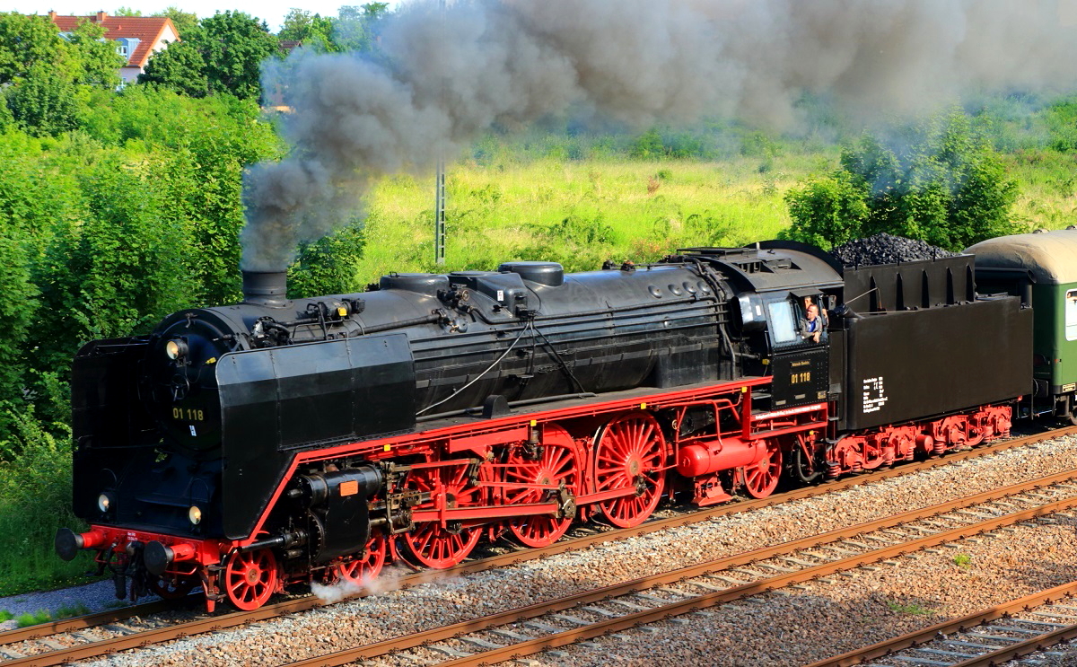 Von der Nachmittagssonne beschienen verläßt 01 118 eine knappe Stunde nach 01 202 am 31.05.2014 den Bahnhof Landau/Pfalz