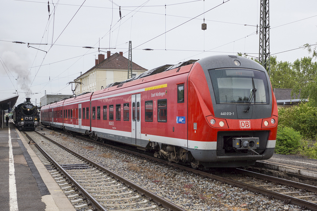 Vor der Rangierfahrt ins Bw von S3/6 Nr. 3673 mit ihrem Sonderzug des Bayerischen Eisenbahnmuseums erhält 440 013-1 "Stadt Nördlingen" Ausfahrt in Richtung Aalen. Bahnhof Nördlingen, 29.05.2014