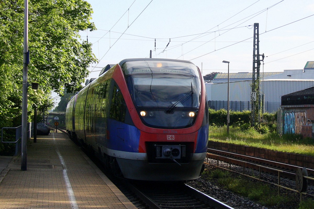Zwei Euregiobahn (RB20) kommt aus Langerwehe-Stolberg-Altstadt nach Heerlen(NL) aus Richtung Aachen-West,Laurensberg,Richterich und hält in Kohlscheid und fährt in Richtung Herzogenrath bei schönem Sonnenschein am Morgen vom 16.5.2014.