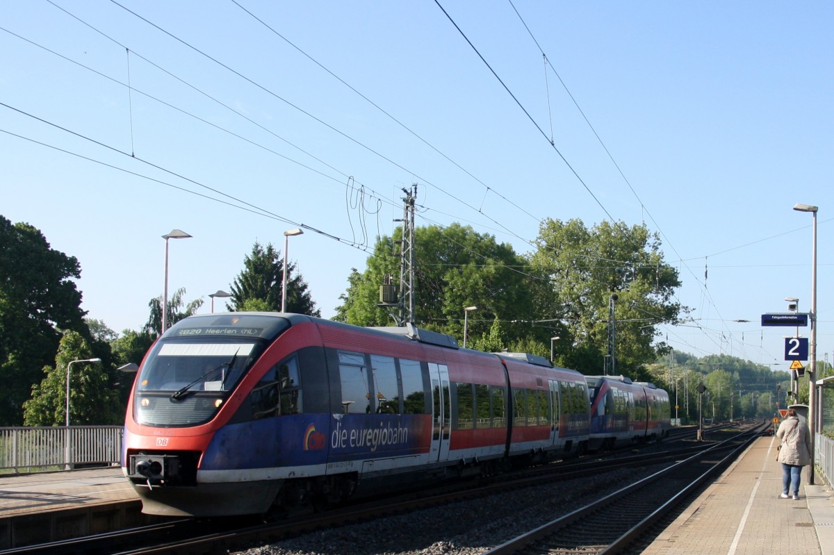 Zwei Euregiobahn (RB20) aus Heerlen(NL)-Stolberg-Altstadt-Düren kommt die Kohlscheider-Rampe hoch aus Richtung Herzogenrath und hält in Kohlscheid und fährt in Richtung Richterich,Laurensberg,Aachen-West bei Sonne und Wolken am Morgen des 15.5.2014.