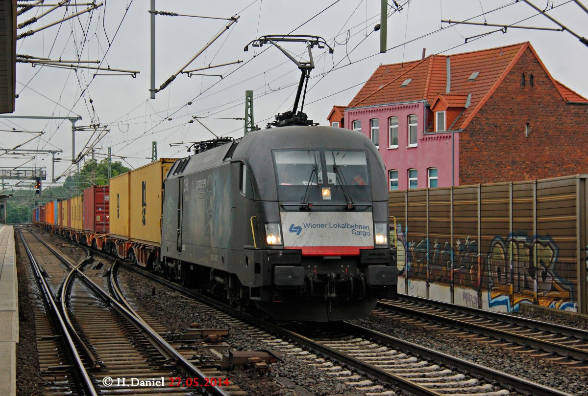 182 515 "ÖBB rail power" Taurus mit einem Containerzug am 27.05.2014 in Hannover Linden Fischerhof.