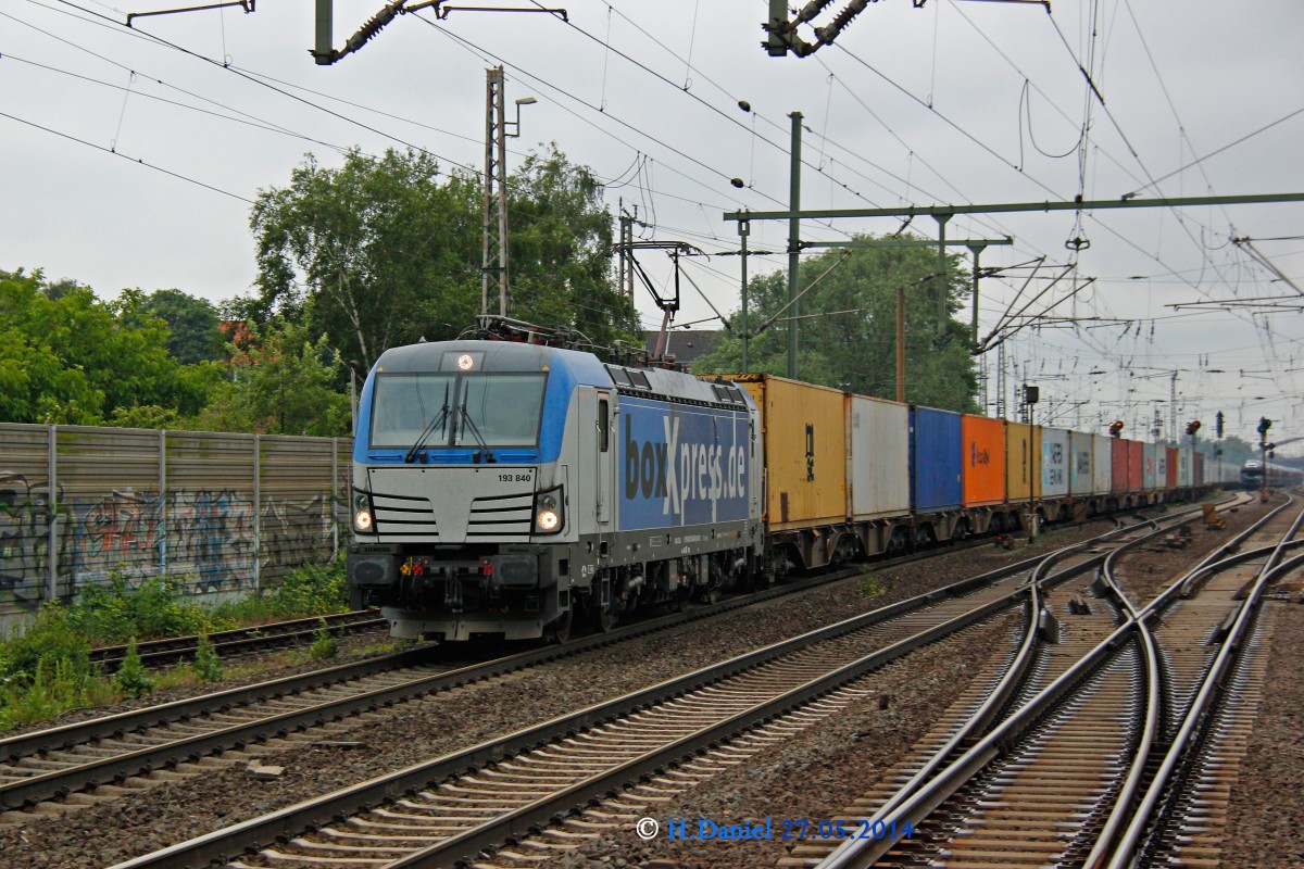 193 840 BoxXpress mit einem Containerzug am 27.05.2014 in Hannover Linden Fischerhof.