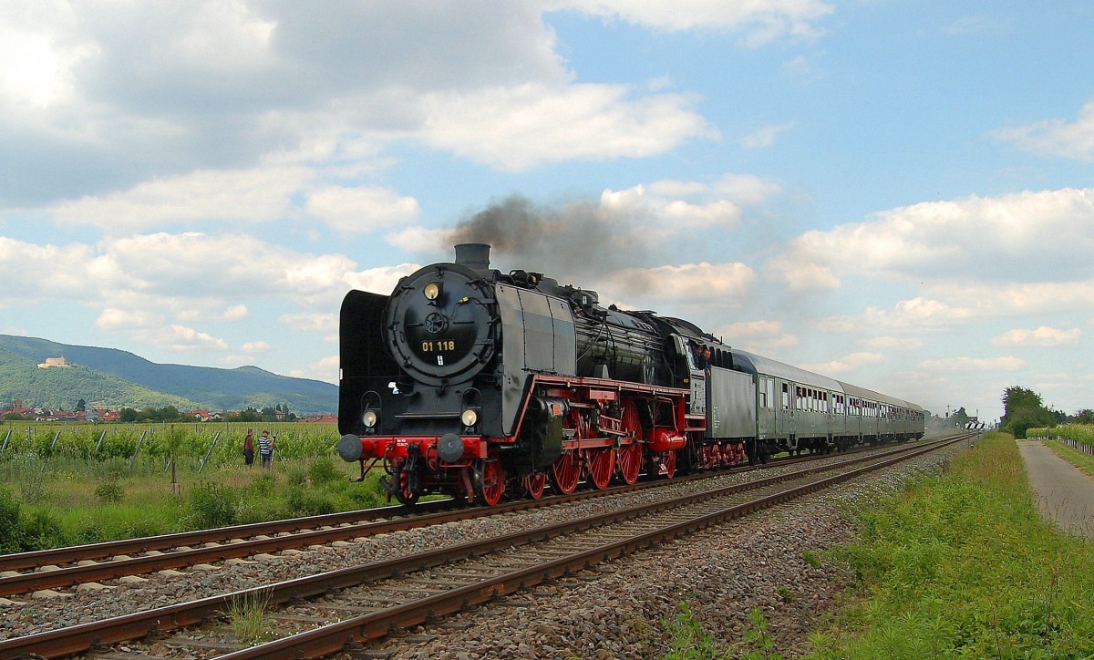 31.05.2014, vierter Tag von insgesamt fünf des Dampfspektakels 2014 in der Region Pfalz-Rhein-Neckar. 01 118 zieht ihren Sonderzug, Neutsadt(Wstr) Hbf - Karlsruhe Hbf, zwischen Maikammer/Kirrweiler & Edenkoben, dem Fahrtziel entgegen. Links im Bild ist das Hambacher Schloss zu erkennen. 31.05.2014