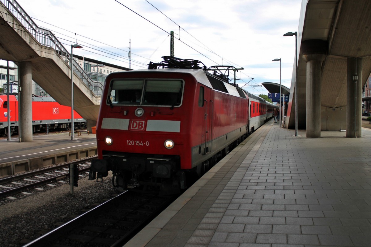 Ausfahrt am Morgen des 24.05.2014 von 120 154-0 mit dem CNL 473 (Kopenhagen CS - Basel SBB) aus dem Hauptbahnhof von Freiburg in Richtung Schweiz.