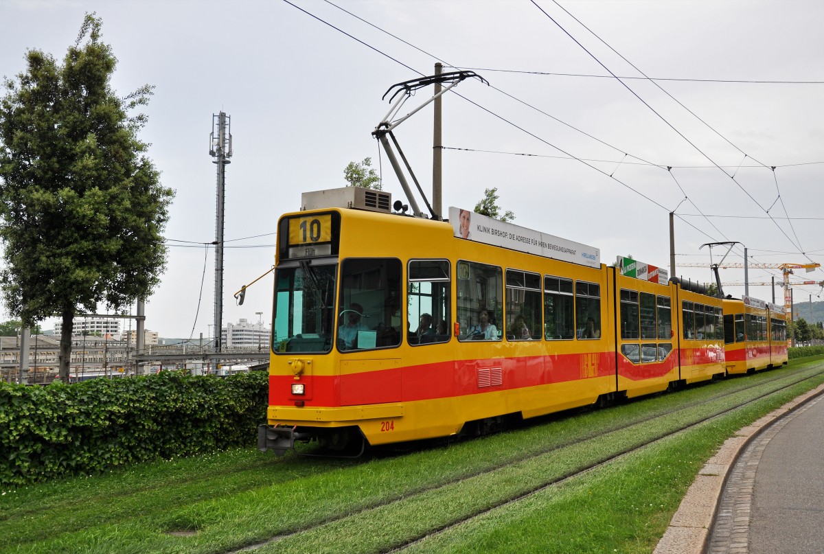 Be 4/8 204 und der Be 4/6 233 auf der Linie 10 kurz vor der Haltestelle Münchensteinerstrasse. Die Aufnahme stammt vom 22.05.2014.