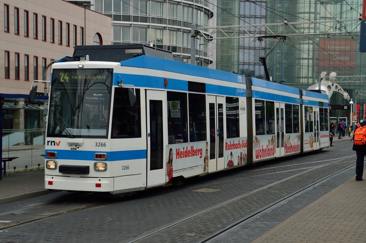 Der Straßembahnwagen 3266 ist hier an der Haltestelle am Heidelberger Hbf. 29.5.2014