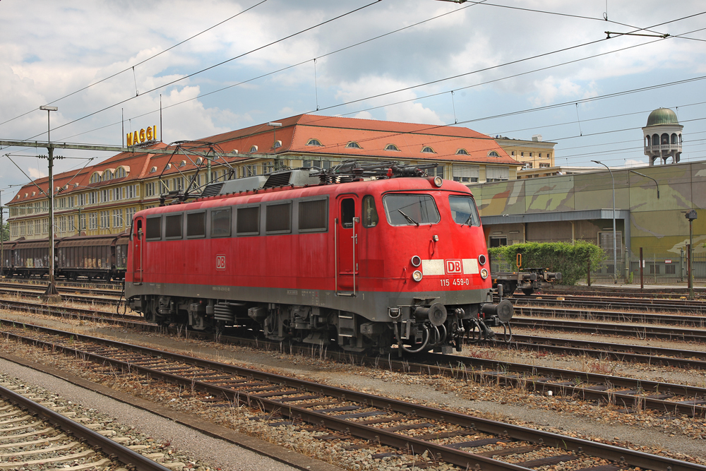 Die 115 459-0 vor Singener Industrie am 3.6.2014 kurz bevor sie den IC Zürich-Stuttgart an den Haken nimmt