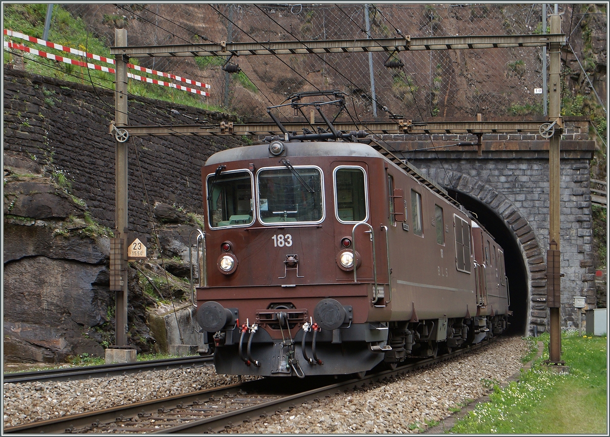 Die BLS Re 4/4 183 verlässt mit einer Schwesterlok und einem langen Güterzug den 1560 Meter langen Prato Kehrtunnel.