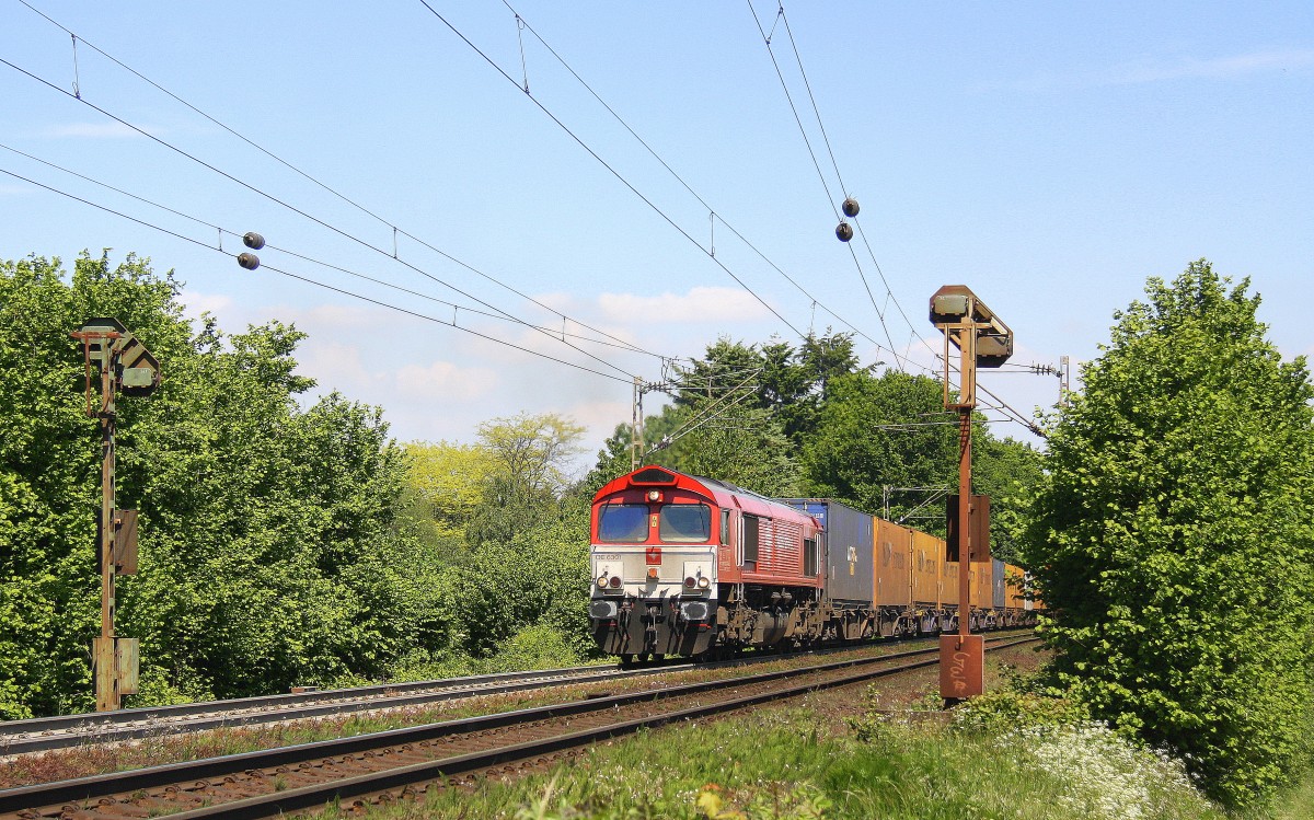 Die Class 66 DE6301 "Debora" von Crossrail grüßt mit Hupe und kommt die Gemmenicher-Rampe hochgefahren mit einem P&O Containerzug aus Gallarate(I) nach Zeebrugge(B) aus Richtung Aachen-West und fährt in Richtung Montzen(B). Aufgenommen an der Montzenroute am Gemmenicher-Weg bei schönem Sommerwetter am Nachmittag vom 18.5.2014.