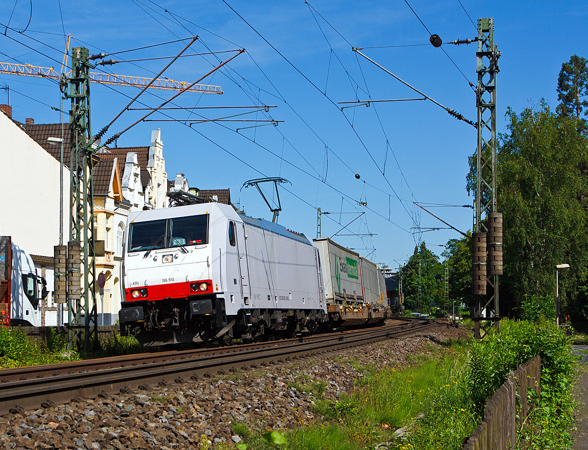 Die für die Crossrail Italia S.r.l. fahrende 186 910 (91 83 2186 910-2 I-XRAIL) zieht am 06.06.2014 einem Hupac-Zug durch Königswinter in Richtung Süden.