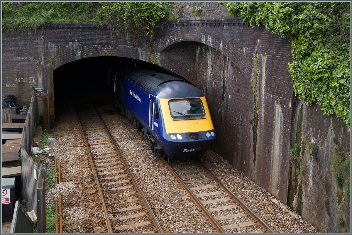 Ein First Great Western Class 43 HST 125 verlässt den Kennaway Tunnel bei Dawlish.