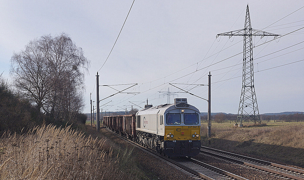 Etwas gegen die Sonne war die 247 042 am 10.02.2014 in Nudow unterwegs. Sie zog einen Zug für die MEG nach Rüdersdorf.