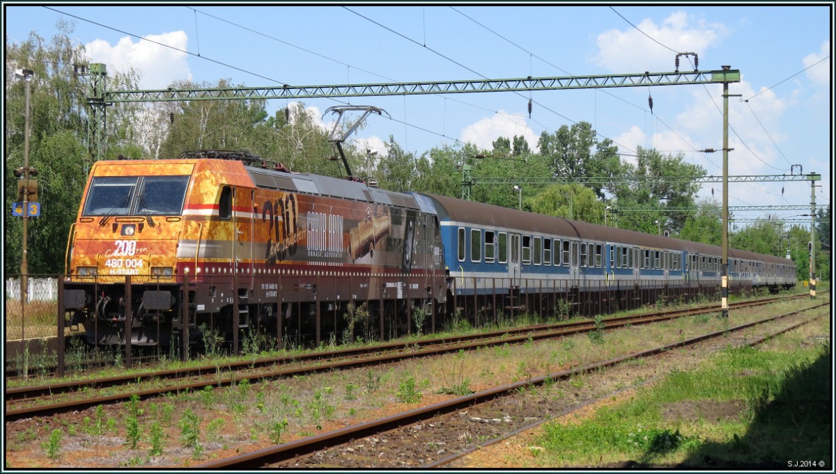 Hier zu sehen der IC Budapest - Split (Croatia) mit einer ungarischen 480. als Zugpferd bei der Durchfahrt in Szántód-Köröshegy unweit vom Balatonufer am 26.05.14.