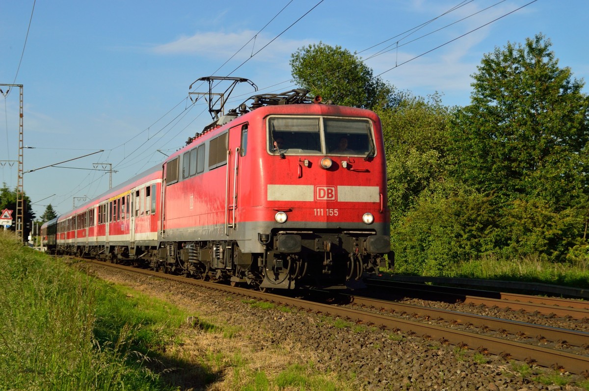 Nach längeren Warten kam dann mal wieder ein Zug, es war ein Verstärkerzug der Linie RE4 nach Aachen der noch vor dem verspäteten IC 2223 bei Wickrath von der 111 155 gezogen am Fotografen vorbei kam. 6.6.2014