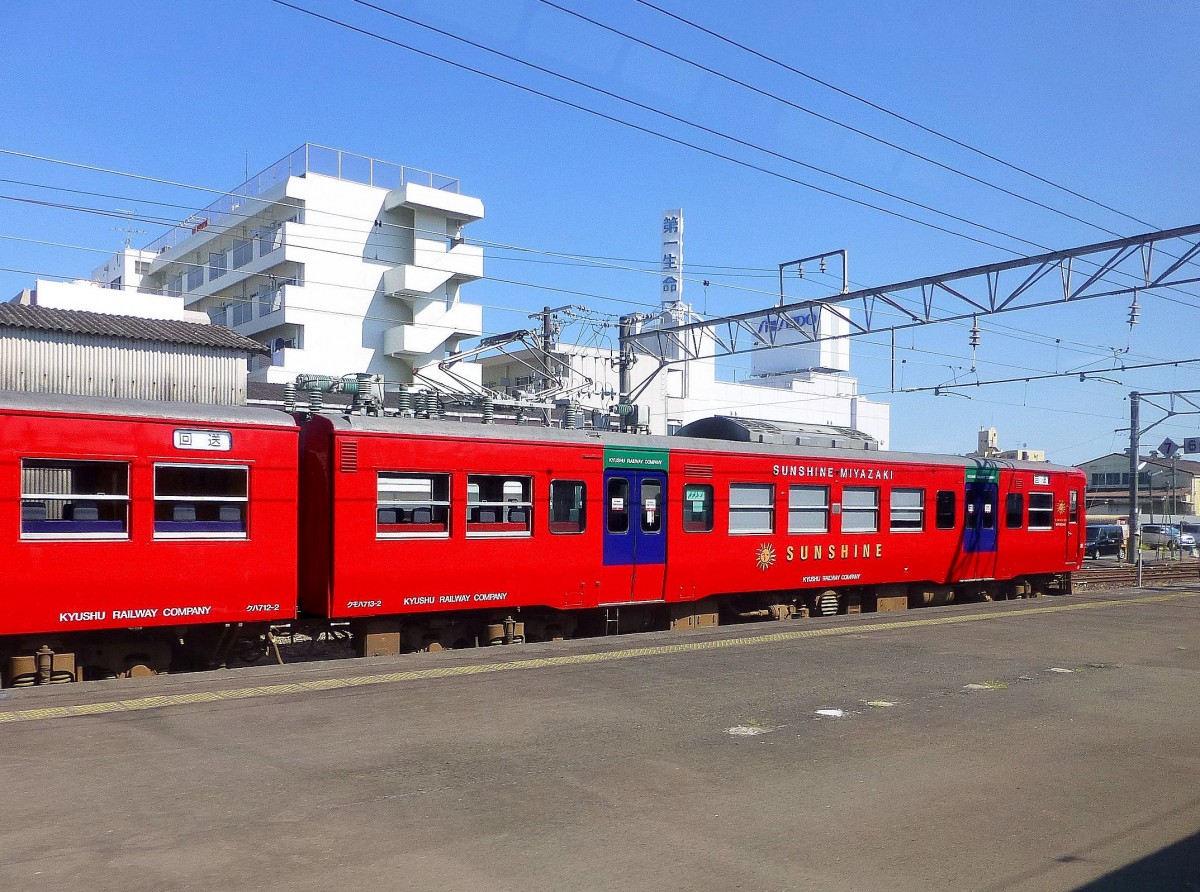 Serie 713: Der strahlend rote motorisierte Endwagen des Zweiwagenzugs 713-2 in Minami Miyazaki, 3.August 2013.