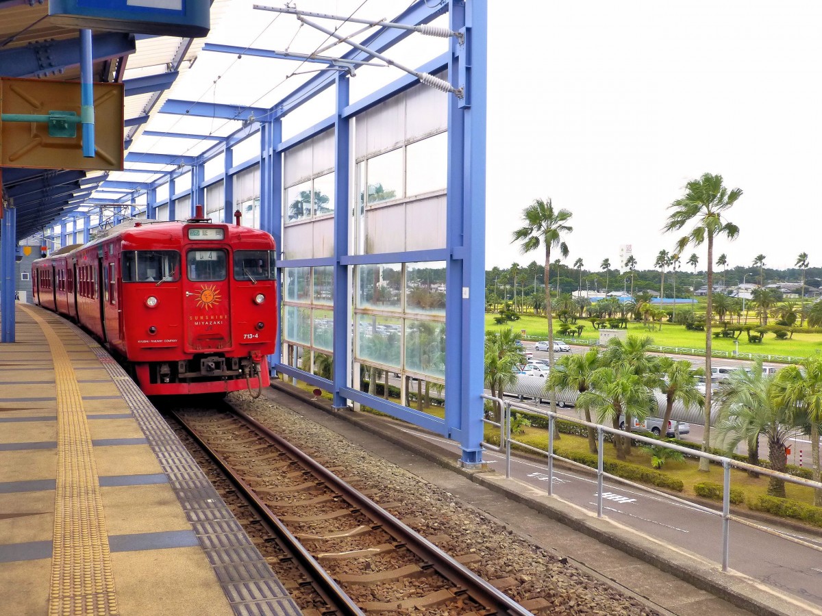 Serie 713: Die 4 Wechselstrom-Wagenpaare Serie 713 sind im Zubringerdienst zum Flughafen Miyazaki im äussersten Südosten der Insel Kyûshû eingesetzt. Im Bild steht Zug 713-4 im Flughafen inmitten der typischen Palmenlandschaft von Süd-Kyûshû, 28.Juli 2013. MIYAZAKI FLUGHAFEN-LINIE