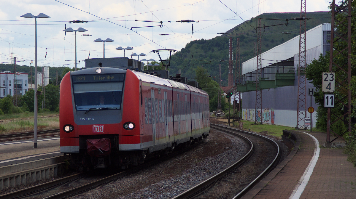 Unterwegs am Umwelttag...Am Umwelttag (05.06.2014) gab es kostenlose Tickets beim V V S (Verkehrsverbund Saar). Ivie und ich machten uns per Regionalbahn von Saarlouis zuerst nach St. Ingbert auf. Bevor unsere RB einfuhr kam der Gegenzug, die RB Homburg - Trier mit 425 137 nach Saarlouis. Bahnstrecke 3230 Saarbrücken - Karthaus