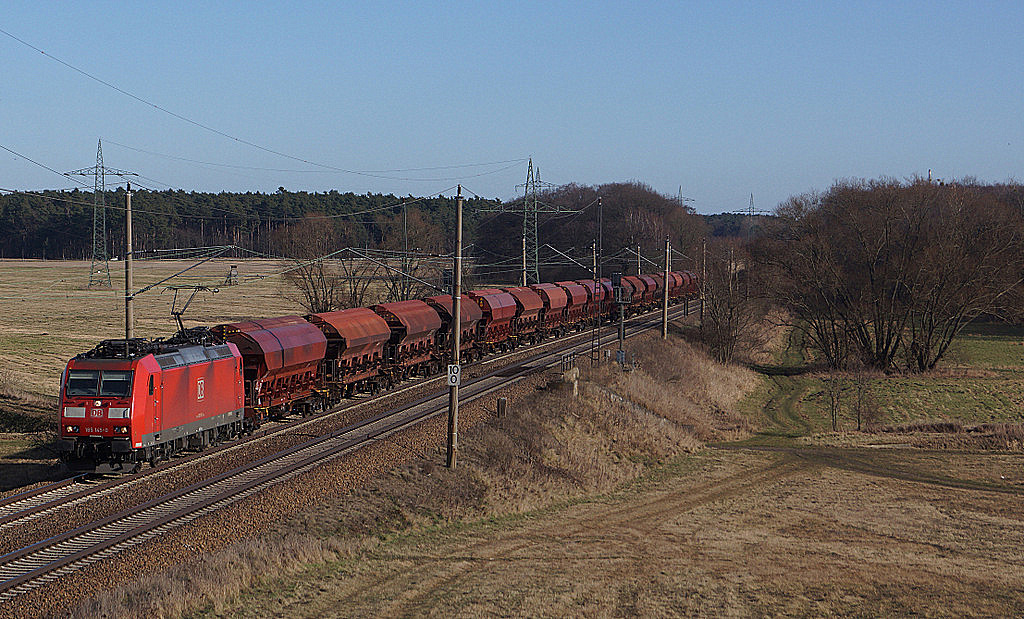 Wenig später in Nudow düste 185 145 mit einem Ganzzug Getreidewagen aus Richtung Genshagen vor die Kamera. 10.02.2014