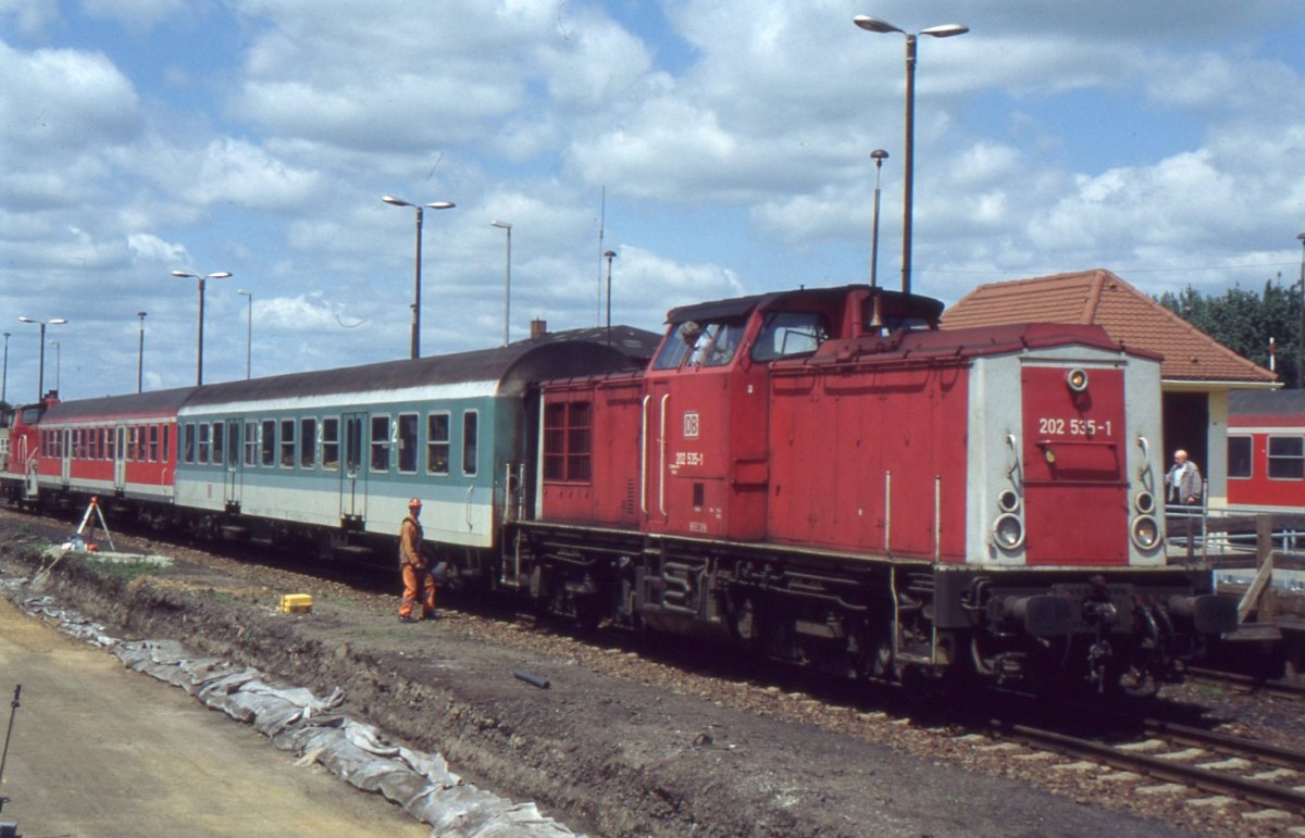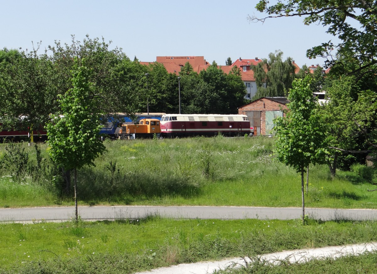 Die NeSa Lok V100 2335 zieht am 4.6.2014 ganz kurz den historischen DRG Bci Wagen 36 652 Stuttgart aus dem Jahre 1929 aus dem BW Rottweil ans Tageslicht um ihn alsbald wieder dahin zurückzuschieben.
