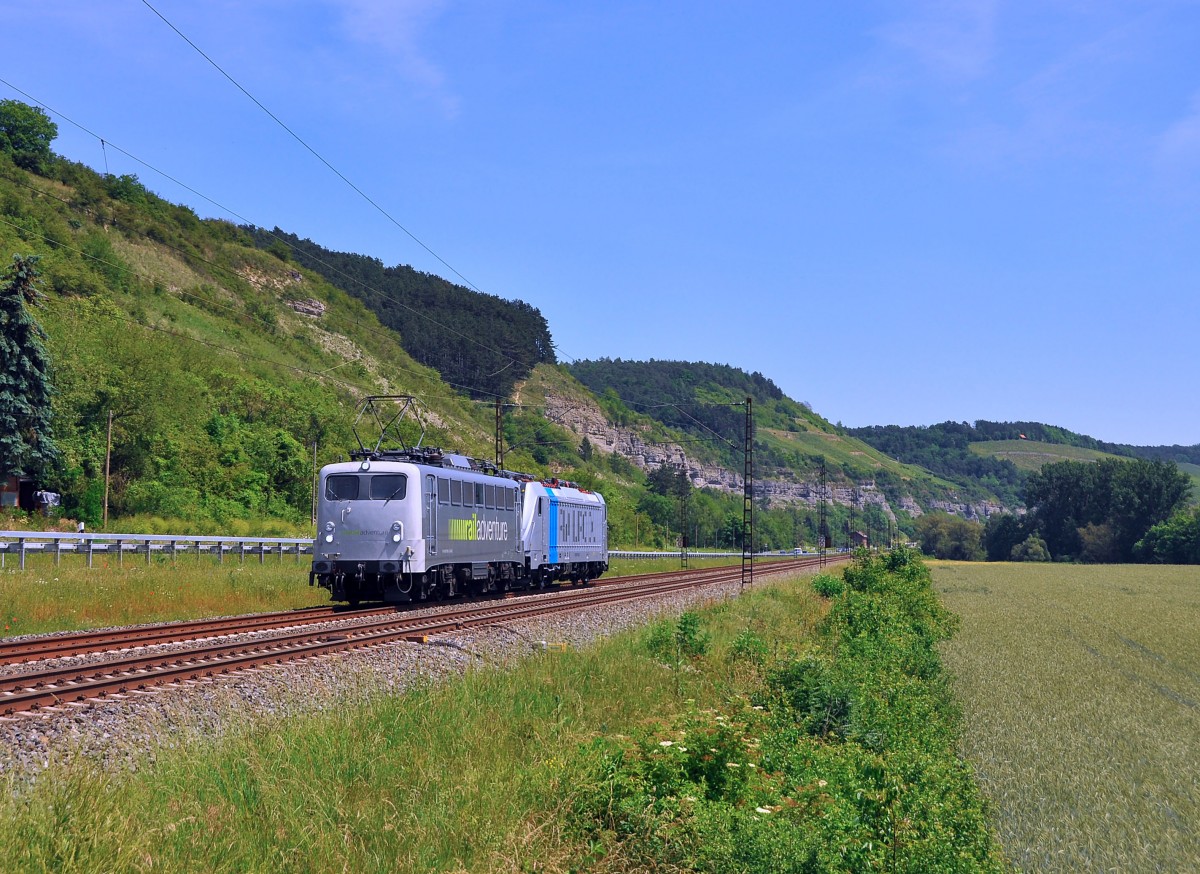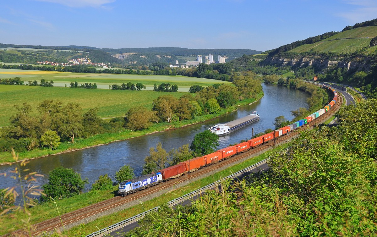 139 558 hat die 187 004 von Bombardier an Haken und fährt durchs Maintal nördwärts Richtung Gemünden.Aufgenommen bei Karlstadt am 7.6.2014