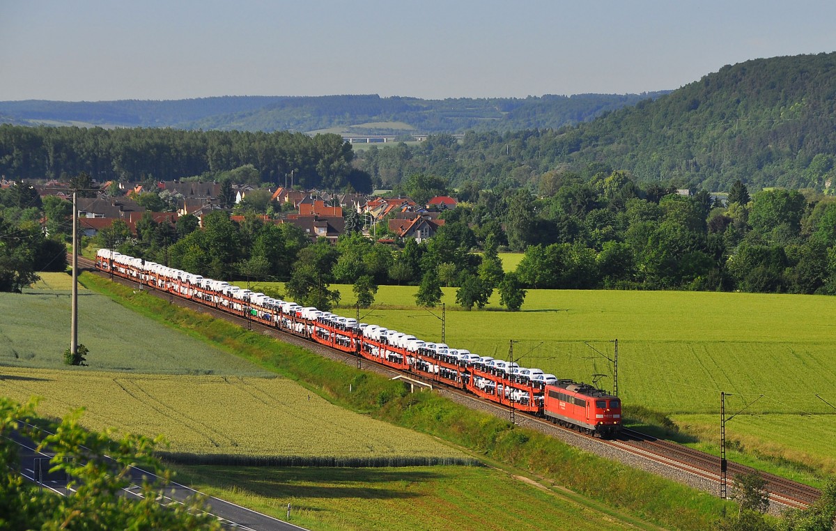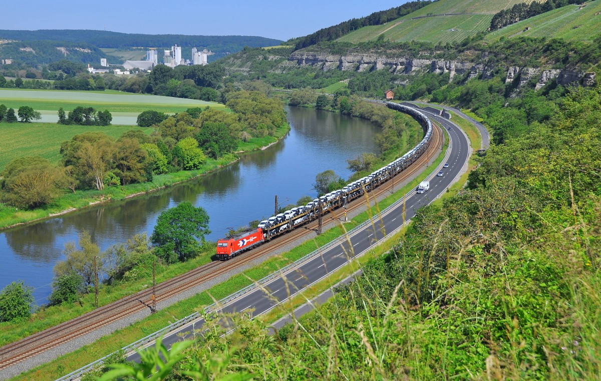 151 165 mit einem Autozug im Maintal Richtung Gemünden.Aufgenommen bei Himmelstadt am 7.6.2014