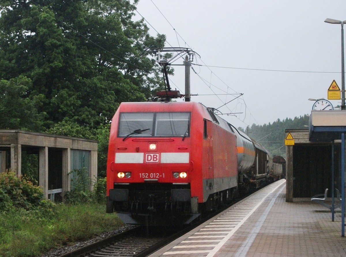 152 012-1 zieht am 29.Mai 2014 einen gemischten Güterzug durch Stockheim(Oberfr) in Richtung Saalfeld.