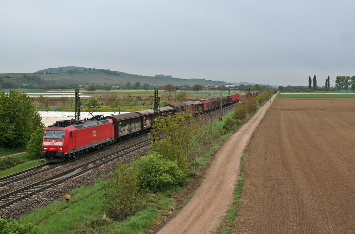 185 130-2 mit einem gemischten Güterzug aus Basel in Richtung Norden am Mittag des 18.04.14 westlich von Hügelheim.