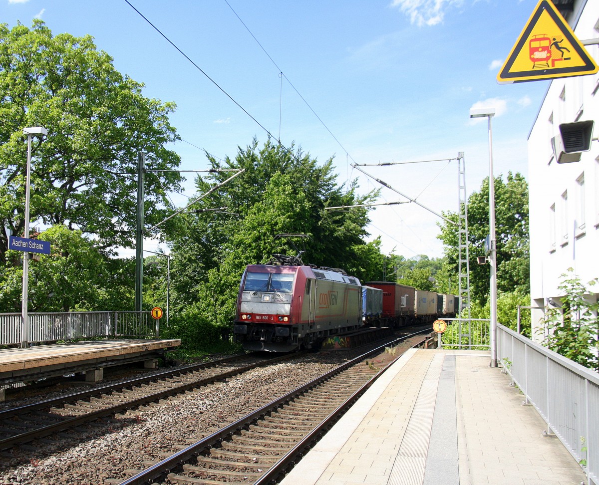 185 601-2 von Crossrail kommt durch Aachen-Schanz mit einem langen Containerzug aus Zeebrugge-Ramskapelle(B) nach Segrate(I) aus Richtung Aachen-West und fährt in Richtung Aachen-Hbf,Köln.