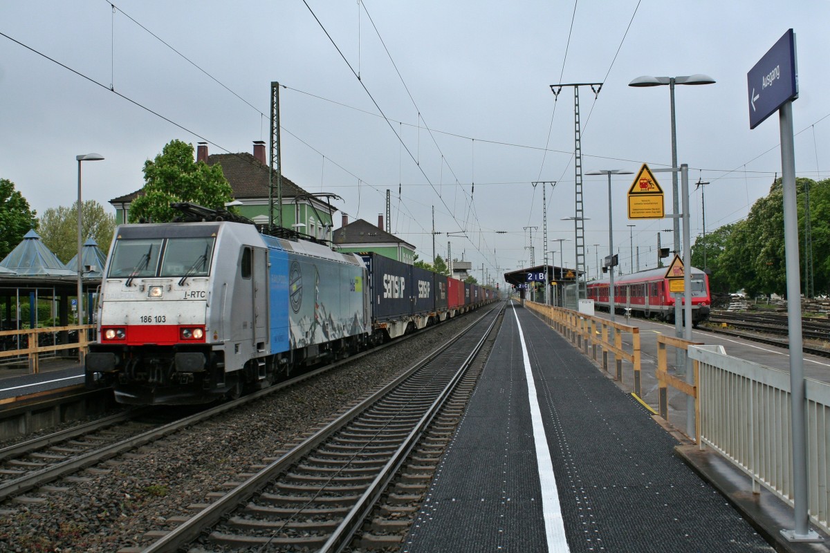 186 103 wurde mit einem KLV-Zug aus Italien in Richtung Holland am Morgen des 18.04.14 im Bahnhof Müllheim (Baden) fotografiert.