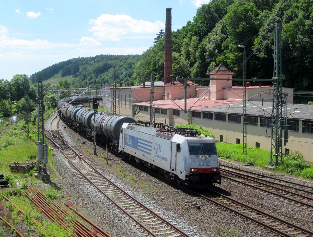 186 238 von LTE zieht am 06. Juni 2014 einen Kesselwagenzug durch Kronach in Richtung Saalfeld.
