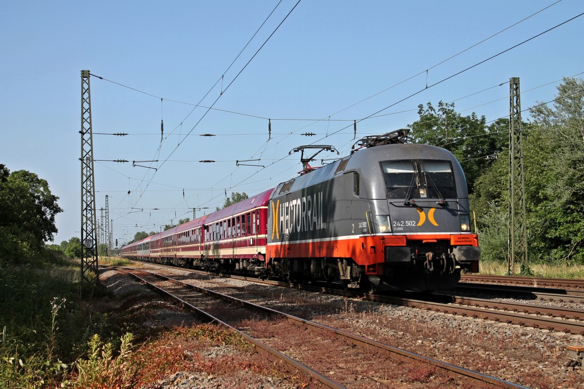 Hectorrail 242.502 "Zurg" am heißen 08.06.2014 mit dem Pilgerzug DPE 13487 (Ulm Hbf - Lourdes) bei der Durchfahrt in Orschweier gen Freiburg.