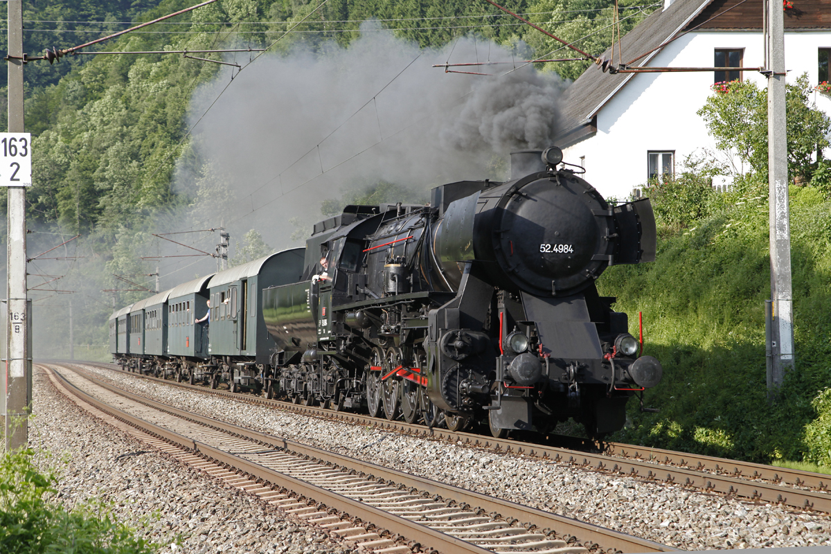 Heuer feiert das Südbahnmuseum in Mürzzuschlag das zehnjährige Bestandsjubiläum, die Semmeringbahn wird in diesem Jahr 160 Jahre alt. Aus diesen beiden Anlässen wurde am Pfingstsonntag dem 8.06.2014 in Mürzzuschlag ein Nostalgiefest gefeiert an dem insgesamt fünf Sonderzüge teilnahmen. Den Sonderzug aus der Landeshauptstadt Graz führte die 52.4984, hier zu sehen auf der Rückfahrt zwischen Bruck-Mur und Pernegg.
