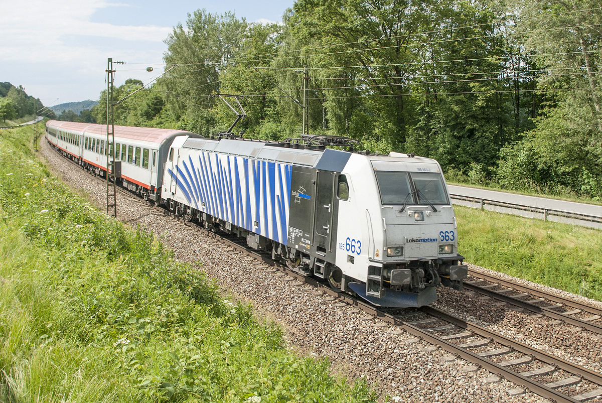 Lokomotion 185 663 befördert einen österreichischen IC in Richtung Linz. Vilshofen a.d. Donau, 01.06.2014
