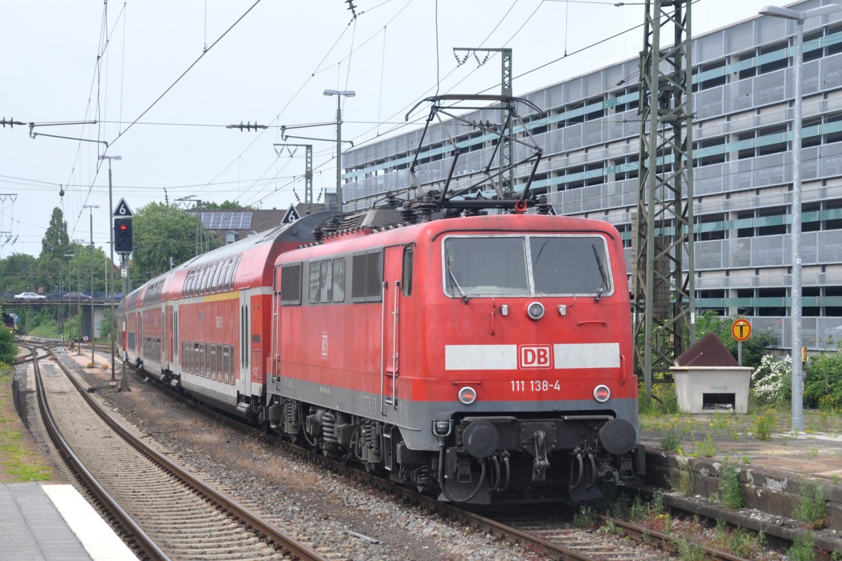 RHEINE (Kreis Steinfurt), 07.06.2014, E-Lok 111 138-4 als RE nach Emden Hbf bei der Ausfahrt