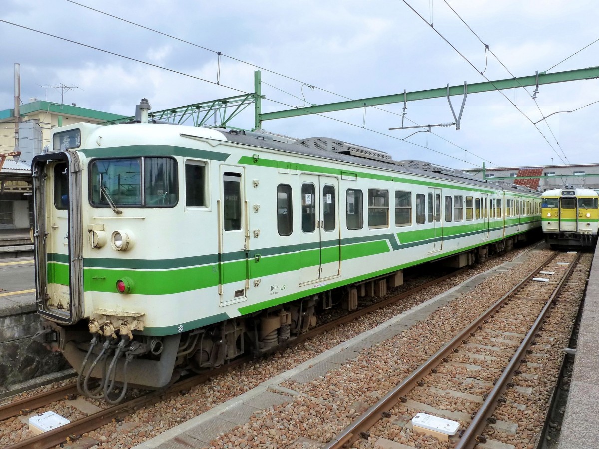 Serie 115 der Region Niigata: Fast der gesamte Regionalverkehr in dem mit Gleichstrom elektrifizierten Netz der Präfektur Niigata in Nordwest-Japan am Japanischen Meer wird (allerdings nur noch für kurze Zeit) mit Zügen Serie 115 erbracht. Dafür gibt es dort 14 Vierwagen-, 33 Dreiwagen- und 19 Zweiwagenzüge, wovon ein Schulungszug. Von den 1963-1983 gebauten Zügen für Steilstrecken und kalte Gebiete (total 1921 Fahrzeuge) existiert noch etwa die Hälfte. Die Grundfarbe der Züge der Präfektur Niigata ist weiss mit grünem Band, wie im Bild der Steuerwagen KUHA 115-553. Rechts ein Zug der Yahiko-Linie. Yoshida, 17.Oktober 2011.