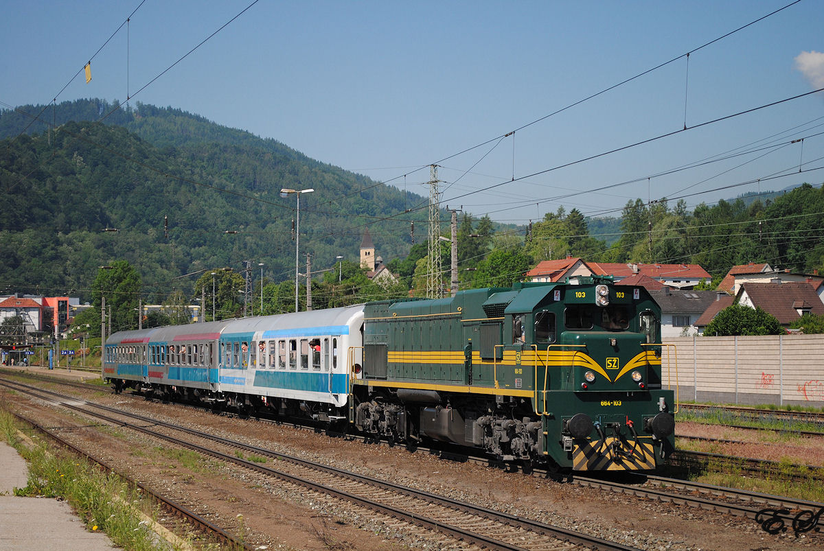 Heuer feiert das Südbahnmuseum in Mürzzuschlag das zehnjährige Bestandsjubiläum, die Semmeringbahn wird in diesm Jahr 160 Jahre alt. Aus diesen beiden Anlässen wurde am Pfingstsonntag dem 8.06.2014 in Mürzzuschlag ein Nostalgiefest gefeiert an dem insgesamt fünf Sonderzüge teilnahmen. Aus Slovenien kam die SZ 664-103 mit ihrem Sonderzug aus Maribor der hier bei Wartberg im Mürztal fotografiert wurde.