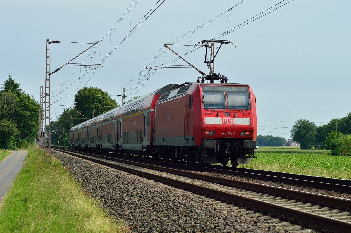 Zwischen Haldern und Mehrhoog auf der Kbs 420 ist die 146 022 mit einem RE5 nach Koblenz unterwegs. 9.5.2014