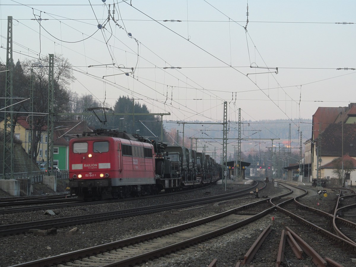 151 041-1 zieht am 11. März 2014 einen Militärzug durch Kronach in Richtung Lichtenfels.